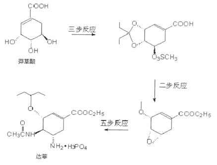 目前世界上已证明“达菲”Tamiflu是治疗禽流感和甲型H1N1流感的一个良方。达菲是以从八角提取的莽草酸为原料,再经过十几步反应得的