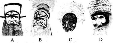 “脸谱化”是中国京剧的一大特色,同时也深受中国传统思想文化影响,刘备被视为汉室传承者,而曹操则被视为篡汉者,视为“不忠”,在舞台上成为奸臣。下列脸谱为曹操的是( )