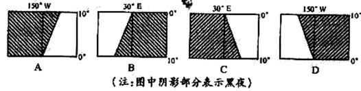 21、若图中表示南半球的状况,当北京时间12点时,下列四图与之相符的是( )