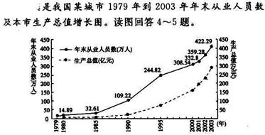 下图是我国某城市1979年到2003年年末从业人员数及本市生产总值增长图。读图,回答24-25题。