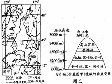 (3)图乙反映了平原东侧山地不同坡向植被的垂直分布,同种植被分布海拔较高一侧按方位是山地的 坡,解释造成这种现象的原因。