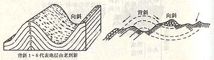 背斜岩层一般向上拱起,向斜岩层一般向下弯曲。从岩层的新老关系看,背斜的中心部分岩层较老,两翼岩层较新;向斜中心部分岩层较新,两翼岩层较老。