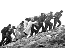 18、右边是一张汶川特大地震中抢运伤员的照片。这张照片震撼人心,请对此写几句简明得体、鲜明生动的话,表达你的颂扬之情。(100字以内)(6分)