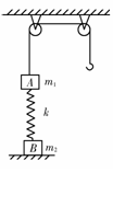 [例3](05年高考全国)如图质量为m1的物体A经一轻质弹簧与下方地面上的质量为m2的物体B相连,弹簧的劲度系数为k,A、B都处于静止状态,一条不可伸长的轻绳绕过轻滑轮,一端连物体A,另一端连一轻挂钩,开始时各段绳都处于伸直状态,A上方的一段绳沿竖直方向.现在挂钩上挂一质量为m3的物体C并从静止状态释放,已知它恰好能使B离开地面但并不继续上升.若将C将成另一质量为(m1+m3)的物体D,仍从上述初始位置由静止状态释放,则这次B刚离地时D的速度的大小是多少?已知重力加速度为g.