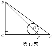如图,在ΔABC中,∠C=90°,AC=8,AB=10,点P在AC上,AP=2,若⊙O的圆心在线段BP上,且⊙O与AB、AC都相切,则⊙O的半径是--(