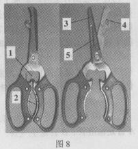 1(6分)如图8是一把厨房里常见的多功能剪刀,特别是图中标有l、2、3、4、5序号的部位都具有一定的功能,且每一项功能都与物理知识息息相关。请你写出其中的三项功能,并说明所用到的物理知识