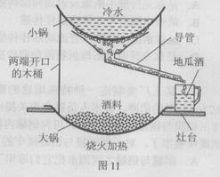 5我国南方某些地区有用“番薯、酒曲、水”做原料酿造“地瓜酒”的习俗。首先将番薯煮熟,晾到一定的温度后,把“番薯、酒曲、水”按。定比例混合并搅拌均匀,经艘酵40天左右,其间每天搅拌一、二次;最后在“酒料”中分离山“地瓜酒”。图11是从“酒料”中提取“地瓜酒”的装置示意图。