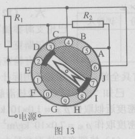五、(13分)如图l 3是一个电热器的工作原理图,电热器内有两个阻值分别为R1=60Ω和R2=120Ω的电热丝;旋转开关内有一块绝缘圆盘,在圆盘的边缘依次有0,1,2,-- 9共10个金属触点;可以绕中心轴转动的开关旋钮两端各有一个金属滑片,转动开关旋钮可以将相邻的触点连接。如旋钮上的箭头指向图中位置D时,金属滑片将2、3触点接通,同时另一端将7、8触点接通。用这个旋转开关可以实现电热器有多挡位工作的要求。请回答: