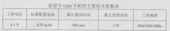/1800 MHz波段。使用手机通话时,微波会对人体产生一种“加热效应”,微波频率越高,人对其能量吸收率就越尚,危害也就越大。下表提供了某种型号手机的技术参数。