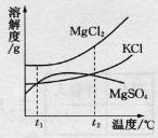 ⑵右上图是MgCl2、KCl和MgSO4三种物质的溶解度曲线示意图。设t1℃时,MgCl2、KCl和MgSO4三种物质的溶解度分别为a、b、c,则它们的大小关系为_________。