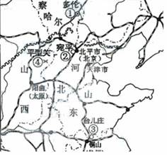 2.(09•北京文综19)图8中数字符号标明的地点,都是抗日战争时期注明战役的发生地,其中能为八路军战史提供实地资料的是 ( )