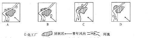 26、如下图,某城市规划建设一个化工厂,下面四种布局较合理的方案是( )