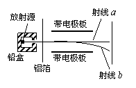 一置于铅盒中的放射源发射的a、b和g射线,由铅盒的小孔射出,在小孔外放一铝箔后,铝箔后的空间有一匀强电场。进入电场后,射线变为a、b两束,射线a沿原来方向行进,射线b发生了偏转,如图所示,则图中的射线a为______射线,射线b为_____射线。