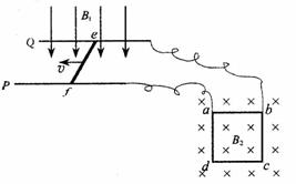 (16分)如图所示,P、Q为水平面内平行放置的光滑金属长直导轨,间距为L1,处在竖直向下、磁感应强度大小为B1的匀强磁场中。一导体杆ef垂直于P、Q放在导轨上,在外力作用下向左做匀速直线运动。质量为m、每边电阻均为r、边长为L2的正方形金属框abcd置于竖直平面内,两顶点a、b通过细导线与导轨相连,磁感应强度大小为B2的匀强磁场垂直金属框向里,金属框恰好处于静止状态。不计其余电阻和细导线对a、b点的作用力。