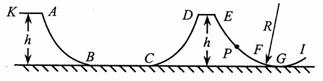 25、(20分)目前,滑板运动受到青少年的追捧。如图是某滑板运动员在一次表演时的一部分赛道在竖直平面内的示意图,赛道光滑,FGI为圆弧赛道,半径R=6.5 m,G为最低点并与水平赛道BC位于同一水平面,KA、DE平台的高度都为h=18 m。B、C、F处平滑连接。滑板a和b的质量均为m,m=5 kg,运动员质量为M,M=45 kg。