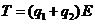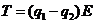 两个质量相同的小球用不可伸长的细线连结,置于场强为E的匀强电场中,小球1和小球2均带正电,电量分别为q1和q2(q1>q2)。将细线拉直并使之与电场方向平行,如图所示。若将两小球同时从静止状态释放,则释放后细线中的张力T为(不计重力及两小球间的库仑力)