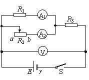 在如图所示的电路中,E为电源电动势,r为电源内阻,R1和R3均为定值电阻,R2为滑动变阻器。当R2的滑动触点在a端时合上开关S,此时三个电表A1、A2和V的示数分别为I1、I2和U。现将R2的滑动触点向b端移动,则三个电表示数的变化情况是