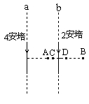 (3)有两根相互平行的无限长直导线a和b,相距15厘米,通过两导线的电流大小和方向如下图所示.在两导线所在的平面内、两电流产生的磁场中,磁感应强度为零的点到导线a和b的距离分别为: