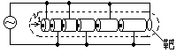 N个长度逐个增大的金属圆筒和一个靶,它们沿轴线排列成一串,如图所示(图中只画出了六个圆筒,作为示意).各筒和靶相间地连接到频率为υ、最大电压值为U的正弦交流电源的两端.整个装置放在高真空容器中.圆筒的两底面中心开有小孔.现有一电量为q、质量为m的正离子沿轴线射入圆筒,并将在圆筒间及圆筒与靶间的缝隙处受到电场力的作用而加速(设圆筒内部没有电场).缝隙的宽度很小,离子穿过缝隙的时间可以不计.已知离子进入第一个圆筒左端的速度为v1,且此时第一、二两个圆筒间的电势差V1-V2=-U.为使打到靶上的离子获得最大能量,各个圆筒的长度应满足什么条件?并求出在这种情况下打到靶上的离子的能量.