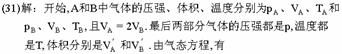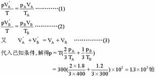 评分标准:全题6分.正确列出(1)、(2)两式给3分(仅仅写出一般的气态方程,而没有体现两边气体末态的压强相等、温度相等的,不给这3分).正确列出(3)式再给1分.正确解出压强p再给2分(数值、单位各占1分).