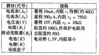 16.(8分)从下表中选出适当的实验器材,设计一电路来测量电流表A1的内阻r1,要求方法简捷,有尽可能高的测量精度,并能测得多组数据。