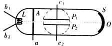 21.(13分)图示为一种可用于测量电子电量e与质量m比例e/m的阴极射线管,管内处于真空状态。图中L是灯丝,当接上电源时可发出电子。A是中央有小圆孔的金属板,当L和A间加上电压时(其电压值比灯丝电压大很多),电子将被加速并沿图中虚直线所示的路径到达荧光屏S上的O点,发出荧光。P1、P2为两块平行于虚直线的金属板,已知两板间距为d。在虚线所示的圆形区域内可施加一匀强磁场,已知其磁感强度为B,方向垂直纸面向外。a、b1、b2、c1、c2都是固定在管壳上的金属引线,E1、E2、E3是三个电压可调并可读出其电压值的直流电源。