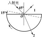 ,入射解为45°(相应的折射角为24°),现保持入射光不变,将半圆柱绕通过O点垂直于图面的轴线顺时针转过15°,如图中虚线所示,则