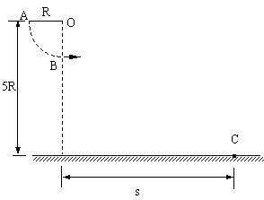 ( 20 分)如图所示,一对杂技演员(都视为质点)乘秋千(秋千绳处于水平位置)从A点由静止出发绕O点下摆,当摆到最低点B时,女演员在极短时间内将男演员沿水平方向推出,然后自已刚好能回到高处A 。求男演员落地点C 与O 点的水平距离s。已知男演员质量m1,和女演员质量m2之比=2,秋千的质量不计,秋千的摆长为R