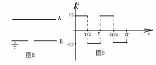 例3、如图8所示中AB是一对平行的金属板,在B板加如图9的方波电压,在0~T/2时间内UB=U0>0,现有一电子从A板上的小孔进入两板间的电场区内,设电子的初速、重力影响均可忽略,则( AB )