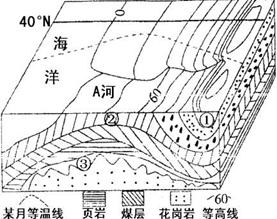 右图为 40°N 附近某地等高线地形图和海平面以下地层示意图。读图完成 35-36 题。