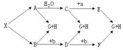 408.某种金属单质X可能发生如下图所示的转化关系,A、B、C、D、E、F、G均为该金属的化合物,G的焰色反应呈黄色。A、B、C、D、E、F与盐酸反应后的产物均为G和H。 ![]()