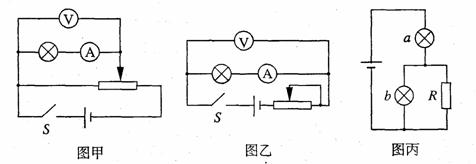 (3)如图丙所示,用一个定值电阻R和两个上述小灯泡组成串并联电路,连接到内阻不计、电动势为3V的电源上.已知流过电阻R的电流是流过灯泡b电流的两倍,则流过灯泡b的电流约为 A.