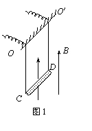 如图1所示,质量为m=50g,长l=10cm的铜棒CD,用长度亦为l的两根轻软导线水平悬吊在竖直向上的匀强磁场中,磁感应强度B=0.5T。未通电时,轻线在竖直方向,通入恒定电流后,棒向右偏转的最大角度