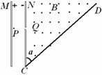 (16分)如图所示,M、N为两块带等量异种电荷的平行金属板,两板间电压可取从零到某一最大值之间的各种数值。静止的带电粒子带电量为+q,质量为m(不计重力),从点P经电场加速后,从小孔 Q进入N板右侧的匀强磁场区域,磁感应强度大小为B,方向垂直于纸面向外,CD为磁场边界上的一绝缘板,它与N板的夹角为a=45°,孔Q到板的下端C的距离为L。当M、N两板间电压取最大值时,粒子恰垂直打在CD板上。求:(1)两板间电压的最大值Um;(2)CD板上可能被粒子打中的区域的长度