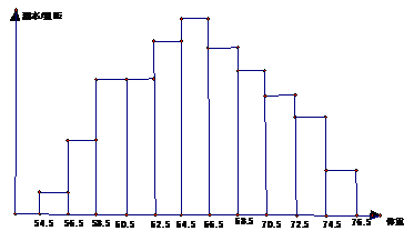 在得到了样本的频率后,就可以对相应的总体情况作出估计.例如可以估计,体重在(64.5,66.5)kg的学生最多,约占学生总数的16%;体重小于58.5kg的学生较少,约占8%;等等 ![]()