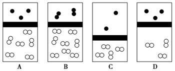 下列示意图中,白球代表氢原子,黑球代表氦原子,方框代表容器,容器中间有一个可以上下滑动的隔板(其质量忽略不计)。其中能表示等质量的氢气与氦气的是 ( )