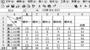 (2)(2分)右图中单元格E10表示的是选修模块四的人数之和。请写出两种计算单元格E10的值的公式 、 。