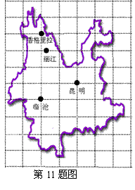 11、如图,2008年奥运火炬在去南省传递传递路线为“昆明-丽江-香格里位),某校学生小明在省地图上设定的临沧市位置点的坐标为(-1,0),火炬传递起点昆明市位置点的坐标为(1,1)。如图,请帮助小明确定出火炬传递终点香格拉位置的坐标为 。