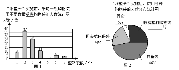 (1)补全图1,“限塑令”实施前,如果每天约有2 000人次到该超市购物.根据这100位顾客平均一次购物使用塑料购物袋的平均数,估计这个超市每天需要为顾客提供多少个塑料购物袋?