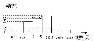 58.(2008湖南株洲)20.未成年人思想道德建设越来越受到社会的关注. 某青少年研究所随机调查了某校100名学生寒假中零花钱的数量(钱数取整数元),以便引导学生树立正确的消费观. 根据调查数据形成了频数分布表和频数分布直方图. 如下表和图所示:
