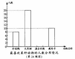 59. (2008黑龙江哈尔滨)哈市某中学为了解该校学生对四种国家一级保护动物的喜爱情况,围绕“在丹顶鹤、大熊猫、滇金丝猴、藏羚羊四种国家一级保护动物中,你最喜欢哪一种动物?(只写一种)”这一问题,在全校范围内随机抽取部分同学进行问卷调查.甲同学根据调查结果计算得知:最喜欢丹顶鹤的学生人数占被抽取人数的 16%;乙同学根据调查结果绘制成如下不完整的条形统计图.请你根据甲、乙两位同学提供的信息解答下列问题: