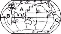 9、图中①②③④四地中位于北半球、西半球的是( )