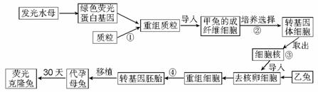(2)在②过程进行转基因体细胞的筛选时,比较简易的筛选方法是通过设备检测,发出明亮的绿色荧光细胞即为转基因体细胞。绿色荧光蛋白在转基因体细胞的 中合成,写出这一过程包含的信息流图解: 。
