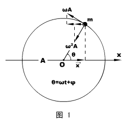 回避高等数学工具,我们可以将简谐运动看成匀速圆周运动在某一条直线上的投影运动(以下均看在x方向的投影),圆周运动的半径即为简谐运动的振幅A