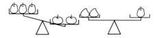 4.(2008永州)如图,a、b、c分别表示苹果、梨、桃子的质量.同类水果质量相等,则下列关系正确的是( )