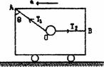 4.如图所示,车厢内用两根细绳AO、BO系住一个质量m的物体,AO绳与竖直方向间夹角为θ,BO是水平的,当车厢以加速度a水平向左作匀加速运动时,两绳中拉力T1、T2各是多少?