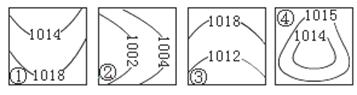 38、在下面四幅比例尺相同的等压线分布图中,按风力由大到小的正确排序是 ( )