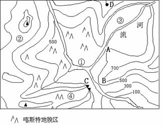 ⑵C处地形为 ,其相对高度最多不超过 米,不低于 米。