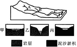 ⑴填出河流在A、B、C三处对应的剖面图(甲、乙、丙)以及流水外力作用方式:A对应