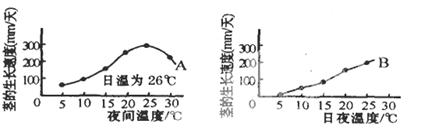 15.在可以调节温度的温室里栽培番茄,以研究昼夜温差对番茄生长的影响,实验结果如下图所示。曲线A是根据番茄植株在日温为26℃,夜温如横坐标所示的温度范围内测定的数据绘制的。曲线B是根据番茄植株在昼夜恒温的情况下,如横坐标所示的温度范围内测定的数据绘制的。则下列说法正确的是( )